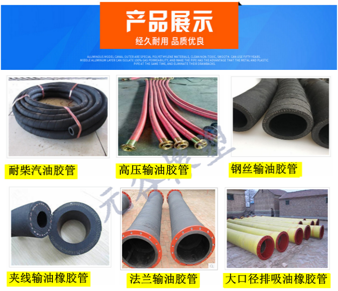 3、耐油膠管:適用于輸送常規石油,在-20℃--45℃環境下使用。